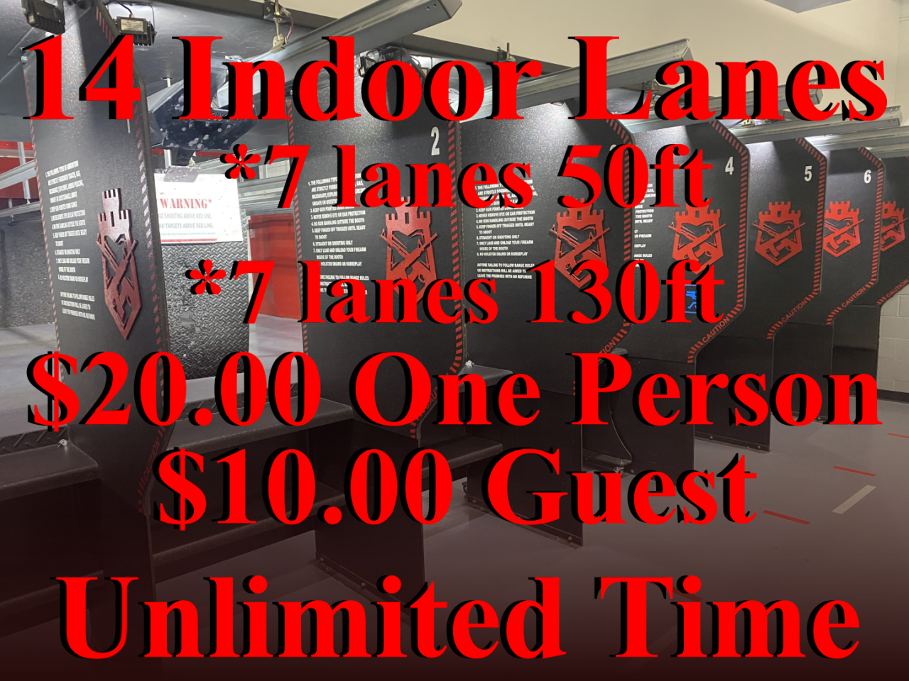 Each lane can have UP TO three people, only one shooter at a time. $20 For One Person $10 For Guest (on the same lane) UNLIMITED TIME!